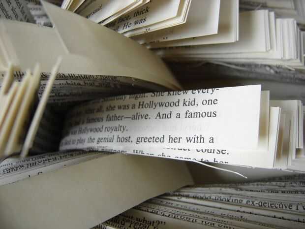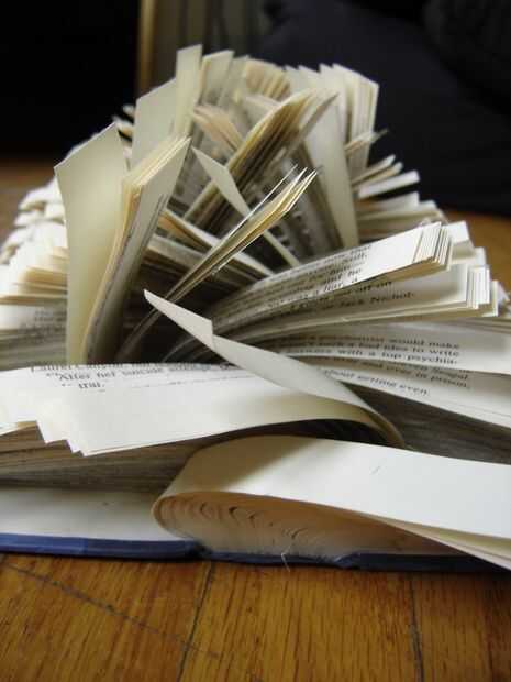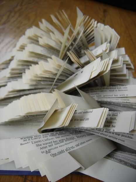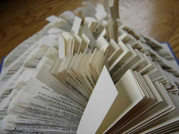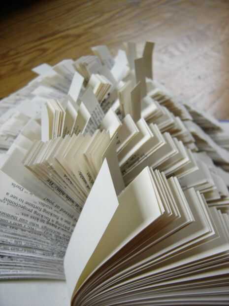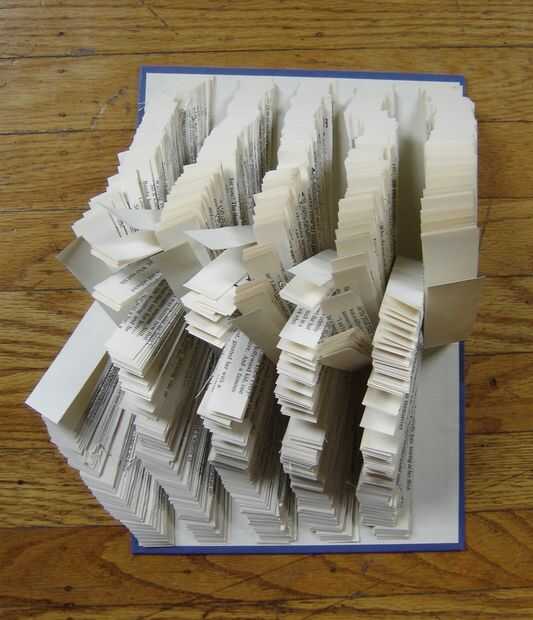 -Dos cortes por página que comienzan al lado de uno a la mitad de la primera página y movimiento hacia el exterior como el avance de páginas, creando una montaña de un lado y un valle en el otro.