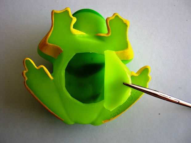 El primer paso es abrir el abdomen de la rana.  Utiliza un cúter o cuchillo Xacto, cortar cuidadosamente la parte inferior de la rana para crear una aleta grande.  La abertura debe ser lo suficientemente grande como para obtener dos dedos dentro para empujar los ojos en su lugar y lo suficientemente grande como para deslizar una batería de 9 voltios en el abdomen.