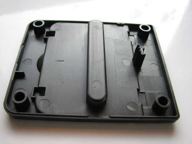 El teléfono (AT & T con una X) era un poco más complicado. En primer lugar, la toma tuvo que dar vuelta alrededor. No hay problema, solo tire desde abajo, girar alrededor y ponerlo de nuevo. Eso está bien, pero el teléfono es lejos del centro y cuelga de la punta derecha. Así que utilicé una broca pequeña y un cuchillo X-acto para crear un nuevo agujero para la clavija. Se pega el enchufe en y entonces yo cortar/interrumpió el pequeño post que celebró el enchufe firmemente en su posición original (a la derecha en la segunda foto) y usa un poco de pegamento para poner justo debajo de la clavija en la nueva posición. Cuñas muy bien entre el conector y la parte inferior del soporte. La próxima vez, creo que sólo usaré una gota de PC-7 o similar epoxy, pero simplemente no tiene alguna alrededor de este tiempo. Por último, doblé una nota adhesiva para traer el respaldo hacia adelante para que coincida con el ángulo del teléfono. Reemplazaré con algo más agradable, como tal vez un pedazo de cinta de espuma.