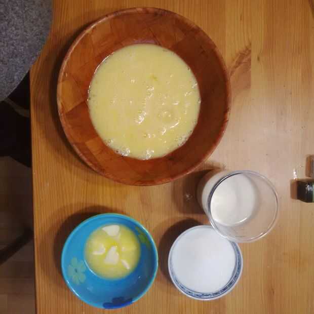 • Añadir la lechey luego añadir la mezcla huevos.