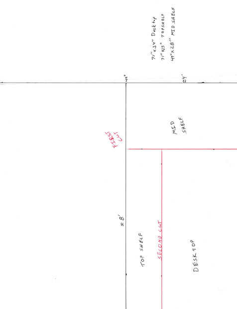 Ahora que tiene su superficie seleccionada te darás cuenta que suelen venir en 4'x 8' voluntad de hojas no caben en tu coche o tu estante. Aquí es donde estas tiendas mano una vez más. Ellos generalmente de servicios de corte, así que esto es donde usted rompe la cinta métrica para asegurarse de que puede tenerlos cortan la madera al tamaño exacto! Acuérdate de cuando tienes que cortar la placa que usted planea tener este una tabla hacer múltiples cosas. De una hoja obtuve una mesa de trabajo y dos estante parcial para ayudar a cubrir el alambre del marco que por lo general viene con estos estantes. La foto de arriba es cómo tuve que cortar mi hoja para asegurarse de que ninguna pieza se perdió!