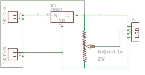 Poner cualquiera de los extremos de la maceta de adorno a través de la alimentación del USB (5V y GND) y ajuste hasta que la tensión de limpiaparabrisas (centro) es de 2V.