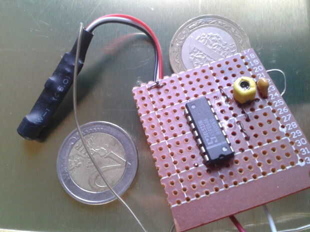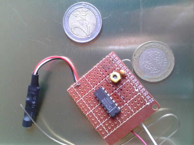 El circuito utiliza el chip NAND SN7413 como oscilador para generar una frecuencia de aproximadamente 100 Mhz que se encuentra dentro de la gama de frecuencia de radio de FM (88 Mhz - 108 Mhz). Este transmisor tiene un alcance de unos 50 metros.
