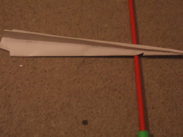 Grapa el avión tres veces a lo largo de donde está el doblez del ala, una vez en el centro y en el muy delantero y la espalda. (No en el timón (el bit de outie pegajoso al final del plano))