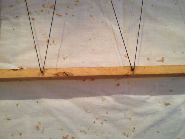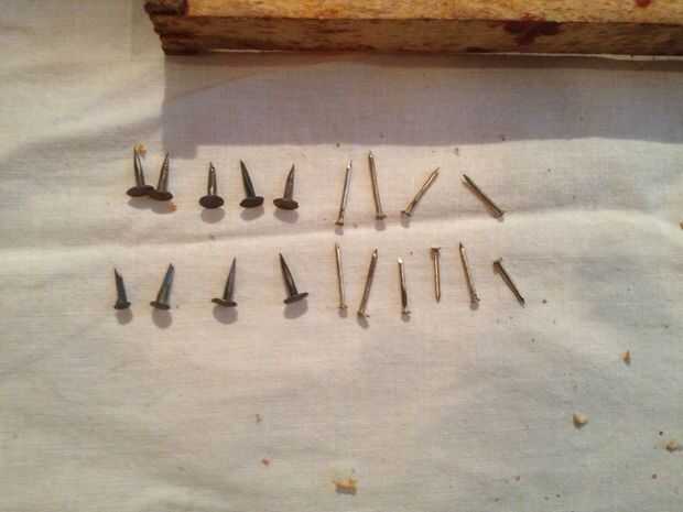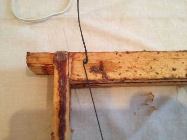 Comience clavando cinco clavos en la parte superior de un lado del marco. No maneje a casa dejan uno o dos mm orgulloso (sobresale)