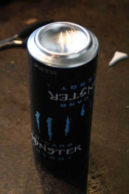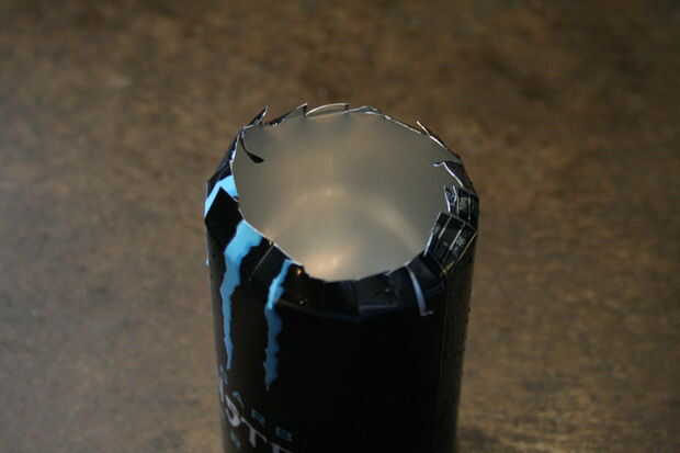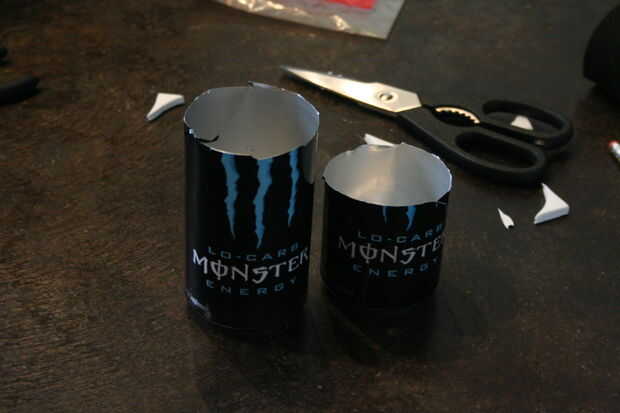Tomar las latas de 2 monster y cortar la mitad en. Poner los extremos que usted bebe de en la papelera de reciclaje.