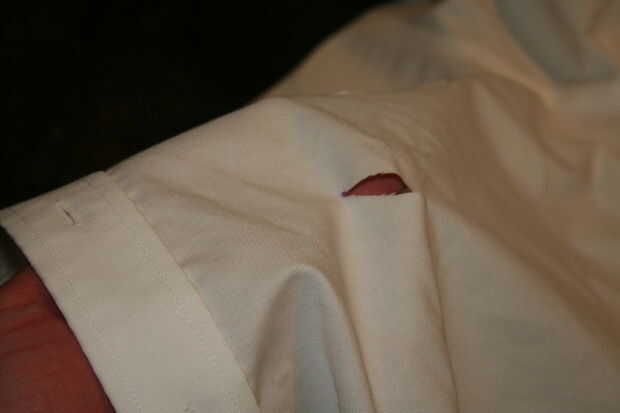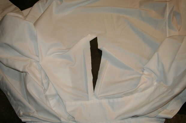 Corta una raja grande el centro de la espalda de la camisa. Esto le permitirá obtener sus brazos en las mangas cuando pones esta cosa en el.