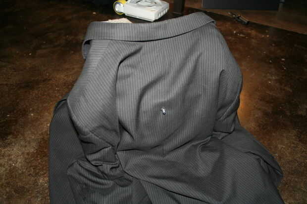 Inserte el tornillo en la parte posterior del arnés y a través de los agujeros hechos en la camisa y la chaqueta.