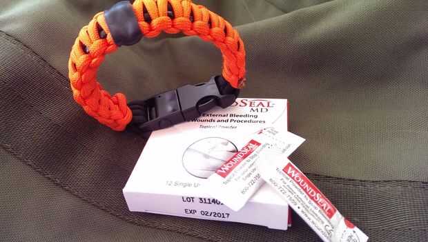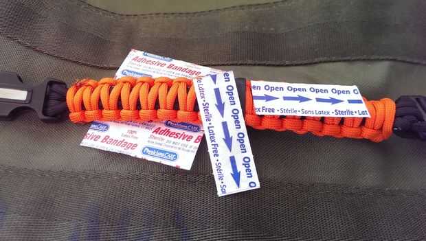 Aplicaciones de primeros auxilios: Forme un torniquete para frenar la pérdida de sangre. Envuelva unos lazos alrededor y colocar un palillo para utilizar como una barra de apriete. Crear Camilla ejecutando paracord entre dos miembros, o hacer una rama de arrastre para mover a una persona lesionada lazo recto pega alrededor de una extremidad rota hacer una tablilla. Atar una eslinga para sujetar un brazo roto coser una herida usando los filamentos internos como suturas.