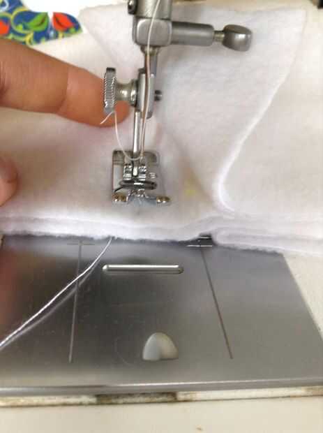 El truco aquí es coser las capas superior e inferior respectivamente a las medianas dos capas antes de coser el centro dos juntos. En primer lugar, simplemente alinee la capa media y superior e inferior para que compartan sus líneas de simetría y coser una línea recta por la mitad para cada par.
