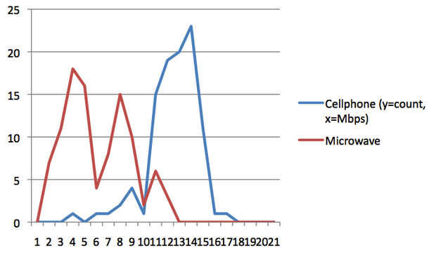 Imagen: iperf3 los resultados con un microondas funcionando (rojo) y dos teléfonos móviles LTE para hacer una llamada (azul).
