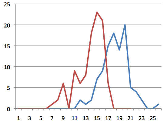 Imagen: resultados de correr iperf3 para intervalos de 100 con una clave previamente generada y en su lugar usando una frase de paso. El eje x es Mbps y el eje y es el número de las mediciones en que ancho de banda.