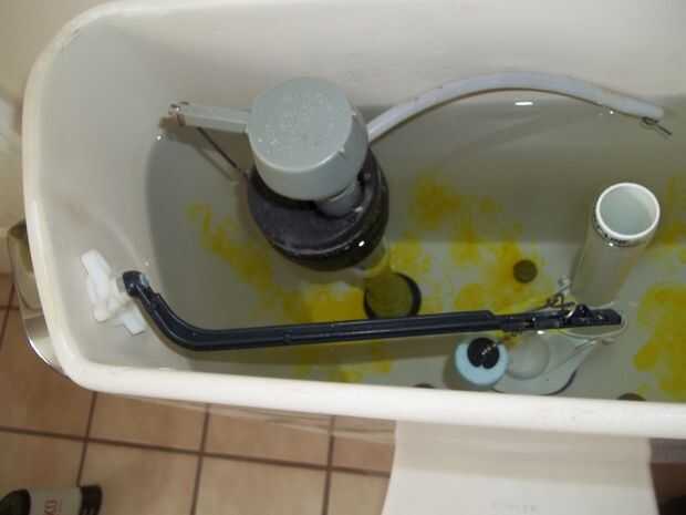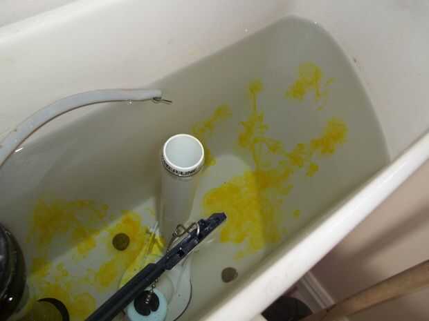 Ahora Haz tus gotas de colorante en el tanque de su inodoro.  Después de un minuto mezclarán en un incluso amarillo.  Si quieres mezclar más rápido supongo que se podría utilizar una cuchara.