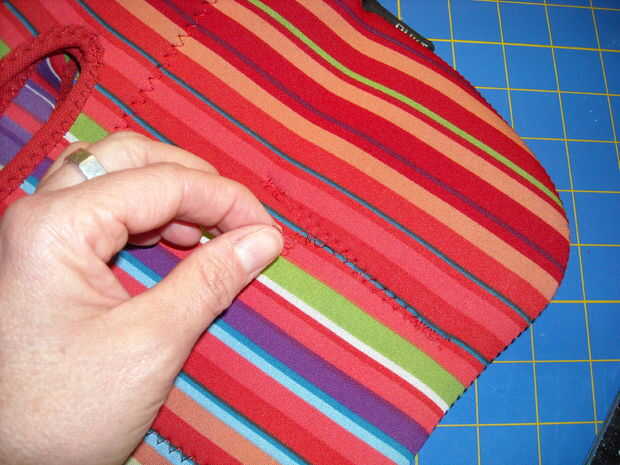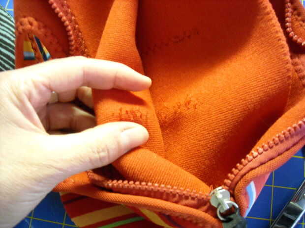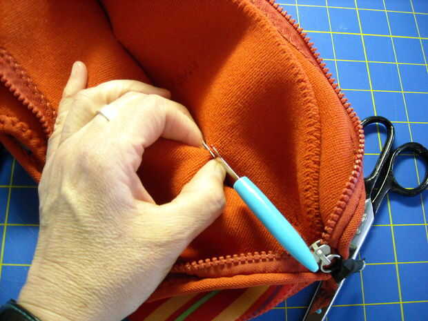 Por un lado eliminar ambas filas de puntadas de zig-zag. Es muy fácil, sólo abrir la bolsa y estirar un poco la bolsa para exponer los puntos de sutura y cuidadosamente corte usando el destripador de la costura. Te sugiero hacer esto desde el interior de la bolsa. De esta manera si el destripador de la costura de capturas o nicks de la tela, no se notará. Las costuras son más estrechos en los extremos de la costura - doble cosido en esas áreas, por lo que es un poco más difícil en los puntos de corte la costura. Una vez que los hilos se cortan, simplemente eliminar todos los trozos sueltos.
