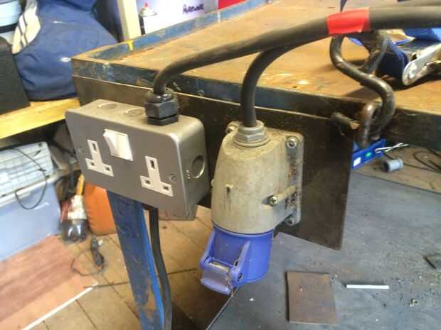 En primer lugar había montado algunos equipos eléctricos, había soldada una placa al lado de la cesta sin el mango y ha añadido un conector de forma de C 16A y un metal había revestido de doble socket. El 16 será para el soldador, mientras que las otras tomas son útiles para amoladoras y taladros.
