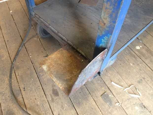 El soldador consiguió un simple estante de MDF de chatarra, apoyado en un lado por un pedazo de ángulo de 2" soldado con autógena a la estructura, podría cambiar esto de un estante de acero en el futuro, pero no tengo ninguna placa de repuesto.