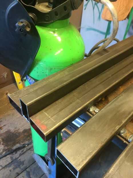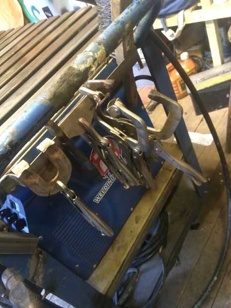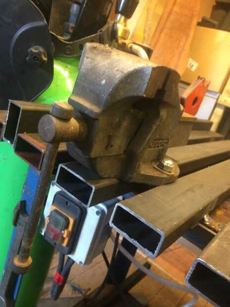 También soldadas en una etiqueta de la tierra, un pedazo de barra de 1" para colgar las herramientas, hecho un montaje para mi vice, que se extiende a un listón y luego se aprieta desde abajo con la mano, por lo que puede mover y quitar fácilmente.