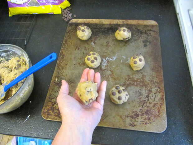 Retire la masa de la galleta del rodillo del refrigerador y mano en bolas de 1/4 taza. Volver sin usar pasta al refrigerador entre tiempos de horneado.
