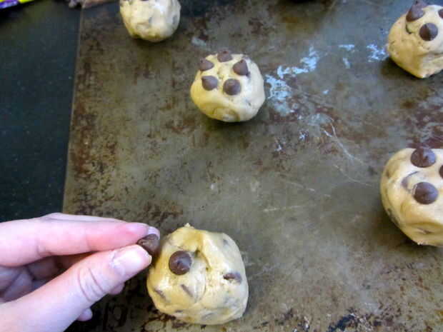 Caída de bolas de masa de galletas a galletas. Galletas deben ser aproximadamente 3 pulgadas aparte... Si usted quiere ser cuidado lugar 6 en una hoja a la vez. También pongo unos chocolates extra en la parte superior para una experiencia visual más agradable.