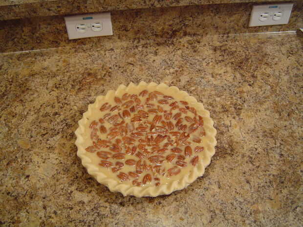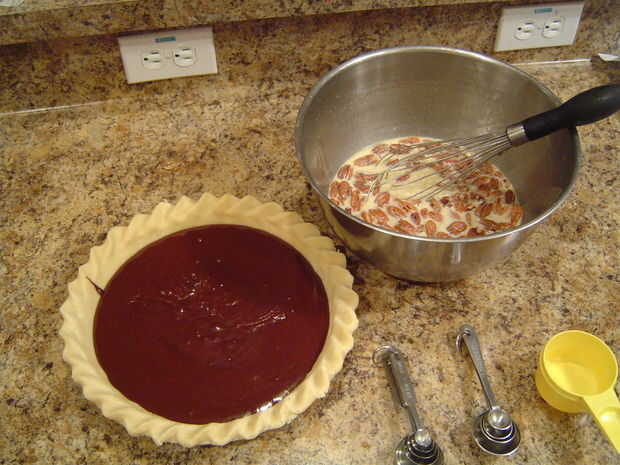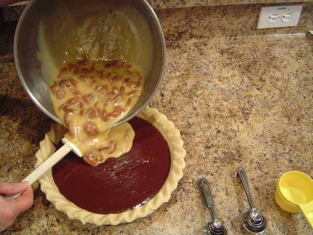 Vierta la mezcla de chocolate en tarta sin hornear.