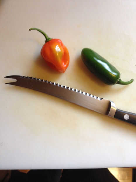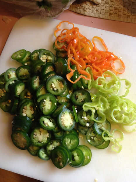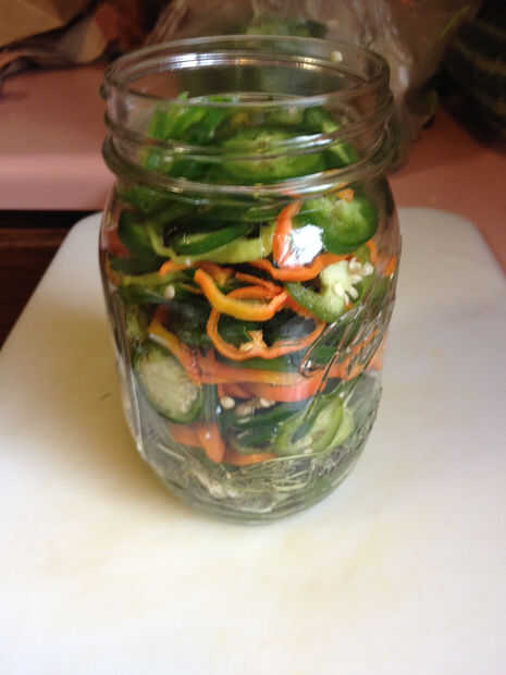 Rebanar los de jalapeño y de Habanero y embalar en la jarra también.