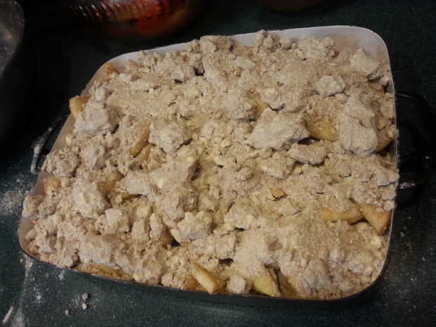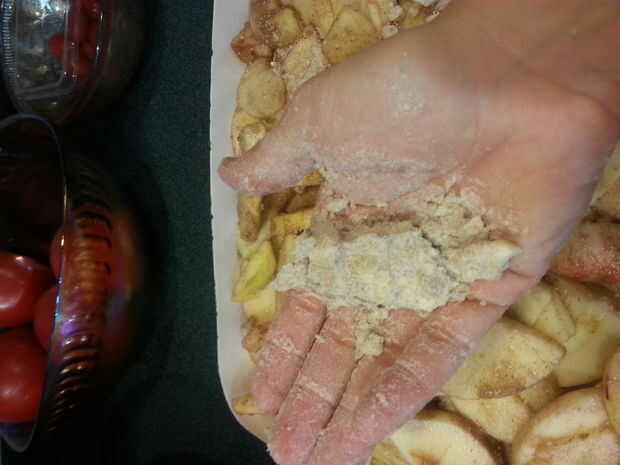 Empezar a colocar la mezcla de cobertura sobre las manzanas. No sólo espolvorear sobre. Usted necesitará clasificación de la cubierta del gancho agarrador y colóquelo en modo que mantienen su forma. Esto hace que esos deliciosos trozos de mantequilla relleno después se cuece al horno. Más trozos mejor. Algunos de ellos se deshagan, y que está bien porque necesita cubrir todo el asunto, pero ir a trozos! Cobertura es de todo el mundo parte favorita, así que no seas tacaño!