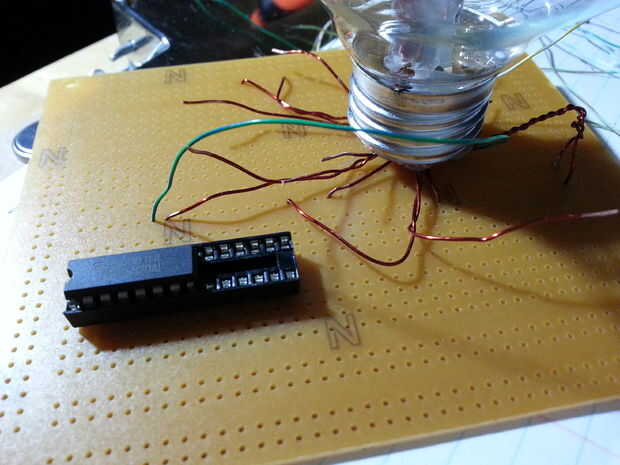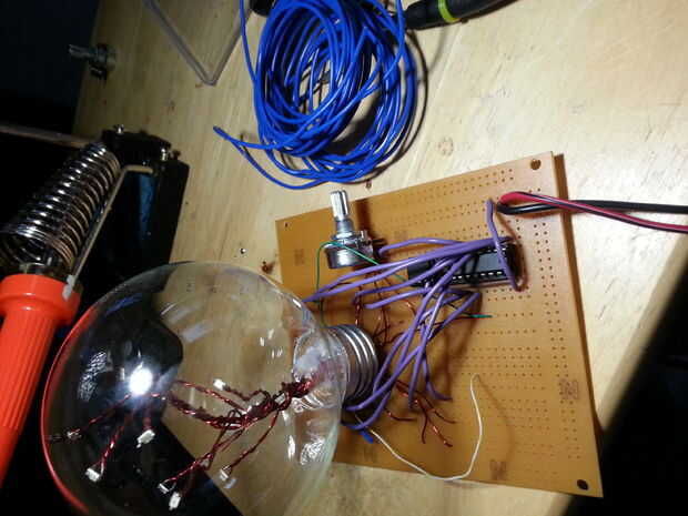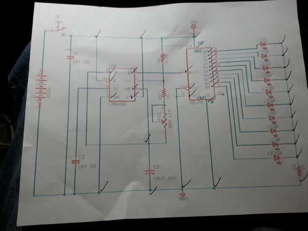 Al azar se iluminará hasta 10 leds y los pasadores de reloj y reset están controlados por un chip 555. Debido a la forma que quería este circuito para ver (desordenado y orgánicos) no puedo mostrar una construcción paso a paso de la Junta como hizo cuando fui a lo largo.