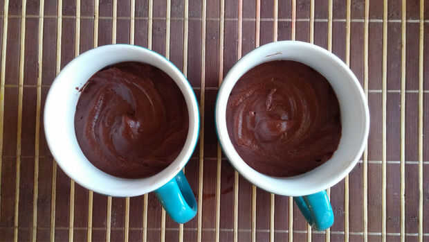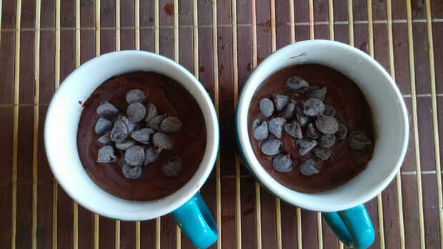 - Dividir la masa de torta igualmente en 2 tazas. Ahora agregue una cucharada de choco chip en el centro de ambas tazas (al microondas, se va ir dentro). Rociar agua en la parte superior del talud. Ayuda a mantener la torta húmeda y pegajosa.