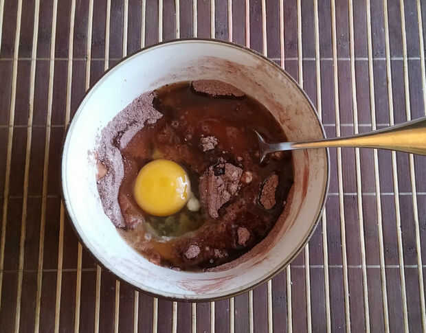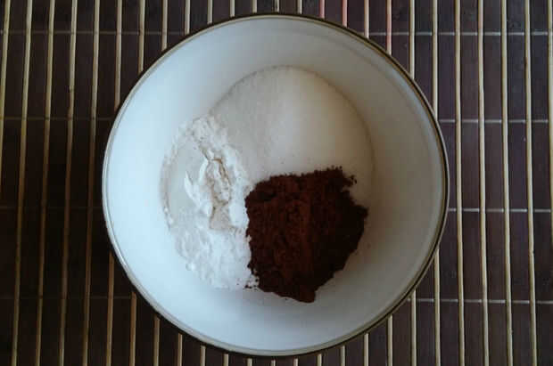 - Tomar todos harina, polvo de cacao, azúcar, polvo de hornear y sal en un tazón pequeño. Bate hasta que todos incorporados.