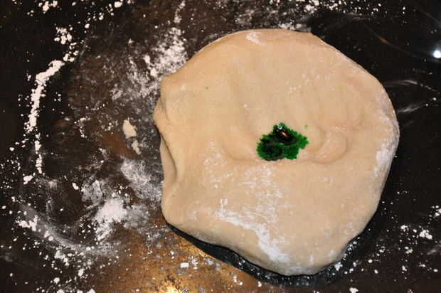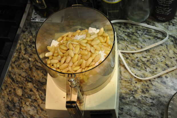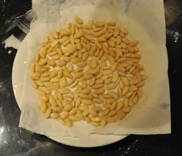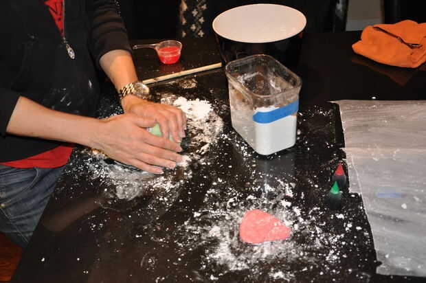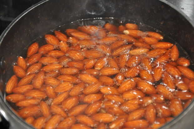 Vierta las almendras en agua hirviendo. Espere hasta que el agua hierva otra vez y las almendras se suben a la superficie, no debería ser más que un par de minutos más. Escurra las almendras en agua y dejarlos enfriar. Pelar las almendras (la piel debe salir fácil) y luego dejo seco (esto se puede hacer un día antes de hacer el resto de la torta). Cuando esté seco, mezclar con 1 dl (0,42 tazas) de azúcar en un procesador de alimentos hasta que el grano fino. Añadir 1 dl en polvo azúcar y suficiente clara de huevo a la mezcla en una pasta suave. De sabor un poco más crecido , puede Agregar una cucharada de brandy a la pasta de almendras. Mezcla de agua, la mantequilla y la harina en una olla y fuego hasta que espese. Mezclar con la pasta de almendras y añadir azúcar de 3 dl (1,27 tazas) en polvo, o lo suficiente como para hacer el mazapán suave y menos pegajosa. Sacar un trozo lo suficientemente grande como para hacer rosas y añadirle colorante de alimentos rojo y amase en el mazapán hasta distribuidos uniformemente. Añadir colorante de alimentos verde a gran parte de los mazapanes y en amasar.