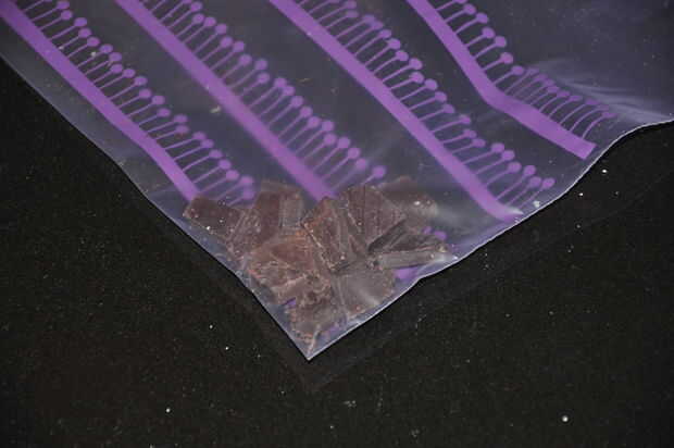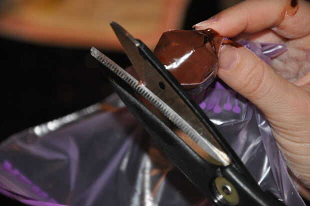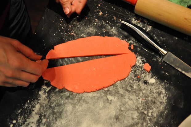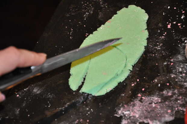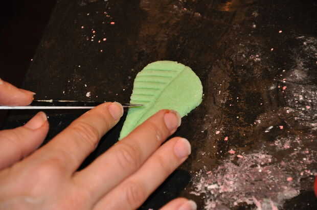 Forma de exceso mazapán verde en las hojas. Corte una tira de gota en forma de lágrima en forma de una hoja. Presione suavemente el cuchillo medio camino a través de la hoja para crear las venas.