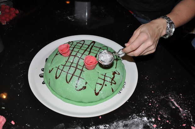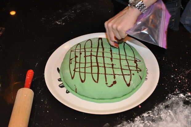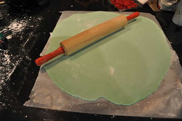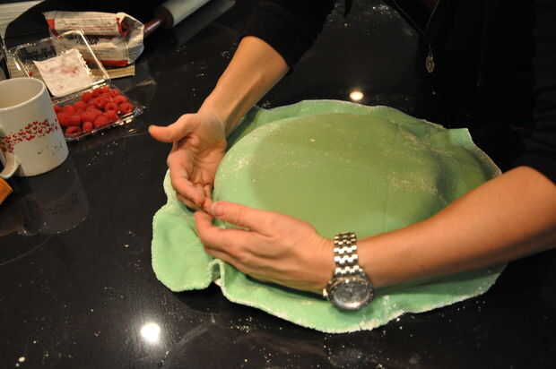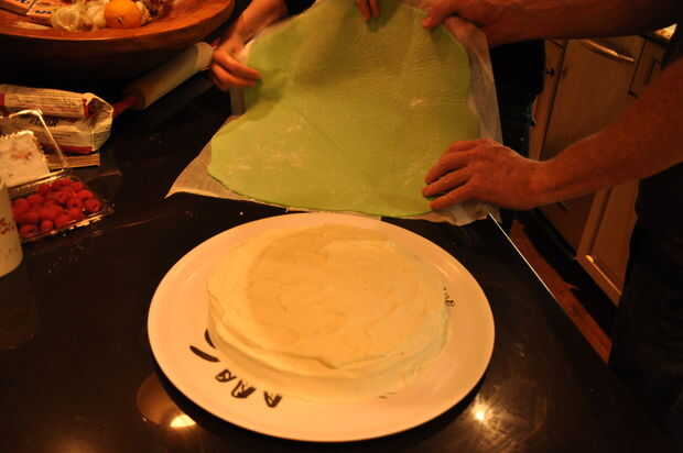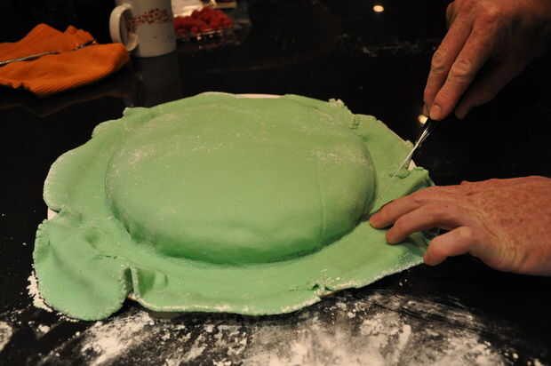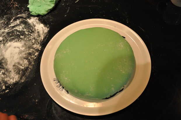 Extienda el mazapán verde en una hoja de papel encerado en un círculo con un diámetro más grande que el pastel. Voltear el mazapán en la parte superior del pastel y retire el papel de cera. El mazapán del doblez en los laterales de la tarta y cortar exceso mazapán.