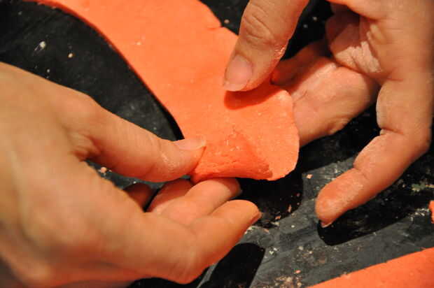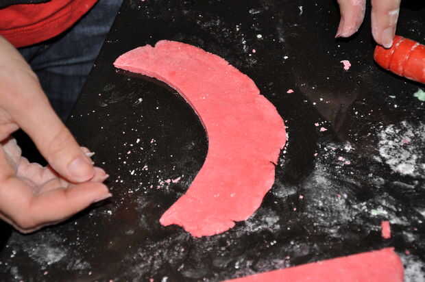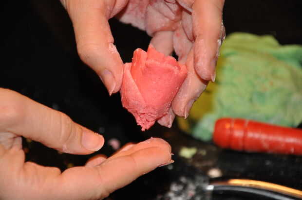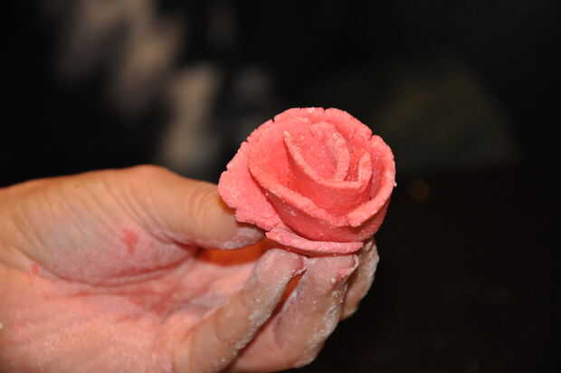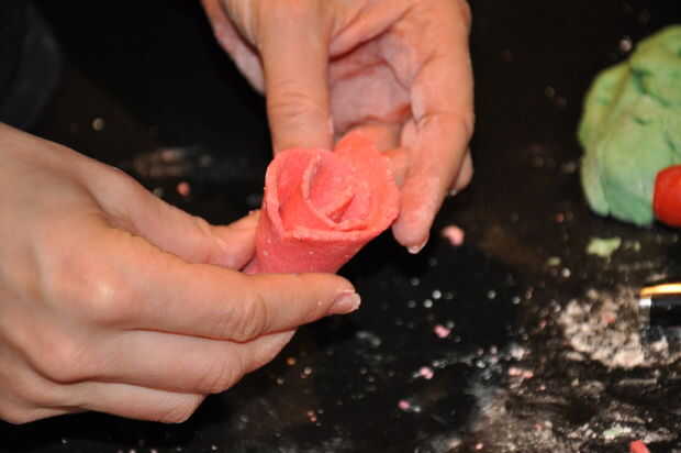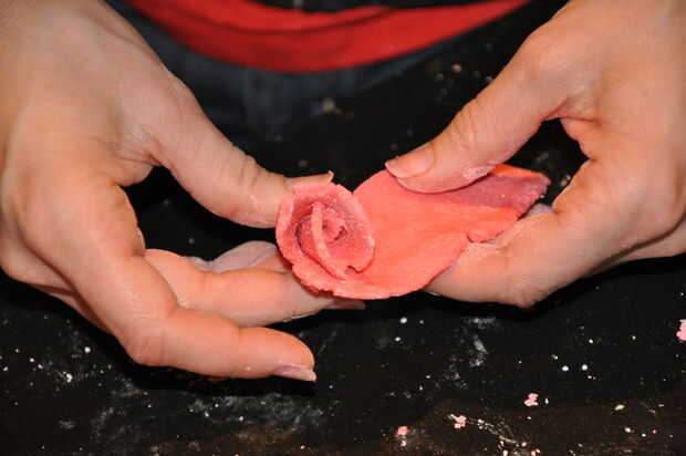 Formar el mazapán de la Rosa rosas. Estirar un pedazo delgado de mazapán color rosa. Cortar una tira de 5 "x 2". Pellizcar un borde largo de la tira para crear una forma de media luna. Rodar el borde largo no pellizquen para formar la rosa como se muestra en las fotos.