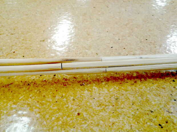 OK ahora que el pegamento se haya secado en nuestra primera caña de mango, podemos hacer a la segunda mitad. Es el mismo proceso como paso 1. Unte el pegamento alrededor de los pinchos de 7 bambú. Paquete de les en una memoria agradable con uno en el centro rodeado por 6 en el exterior. Entonces algunos deslizarse hacia abajo en las ranuras que hicimos en la primera caña de mango. Básicamente estamos justo al lado de ajustar a la mitad de los pinchos para que sus articulaciones no coincidan con ninguno de los otros. Esto hará que para un fuerte vínculo entre los dos bastones por lo que no se desintegraría. No Asegúrese de acoplar los extremos de la recta (blunt) de los pinchos juntos en el medio con el sostenido termina señalando en cada extremo.