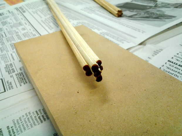 Uno de los extremos queremos a tres de los pinchos que sobresalga para que nos podemos pegar ésos en la cabeza del rastrillo. Así que para hacer esto recortar dos de las puntas de brocheta en cada lado, como en la imagen.