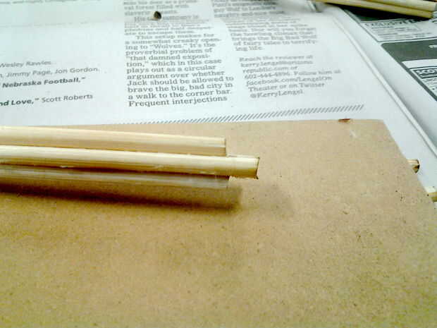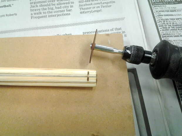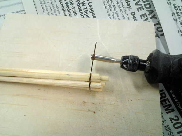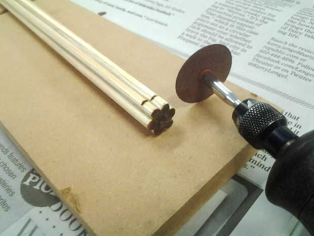En este punto también recortar los extremos de los bastones, los extremos puntiagudos que es. Lo hice con el disco de corte de mi Dremel. Trim ambos extremos de la caña de mango plana.