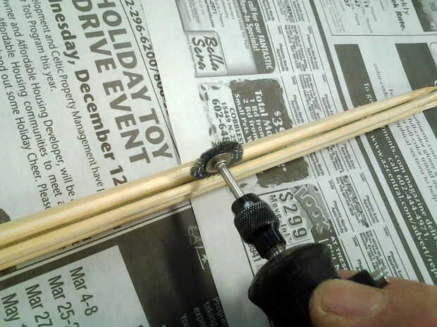 Ahora algunos del pegamento va a espuma para arriba y metido donde no queremos. Tan sólo necesitamos limpiar un poco de aspecto. Lo hice usando un accesorio de la rueda de alambre para mi Dremel, a baja velocidad. Esto limpia el pegamento extra de nuestros bastones de rápida y sencillas.
