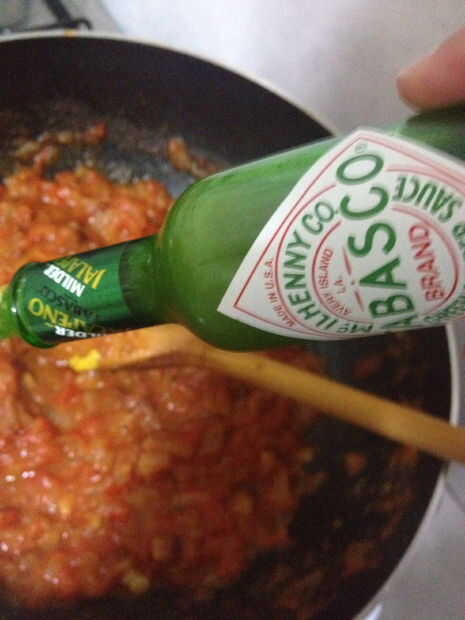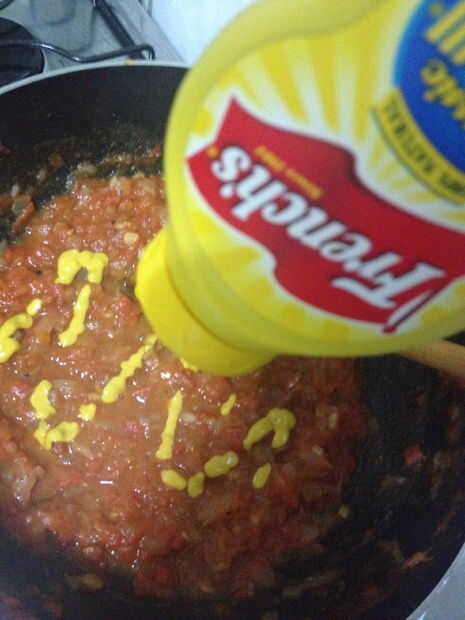 Revuelva hasta que los tomates empiecen a derretir y agregar el Tabasco, la pimienta y la mostaza
