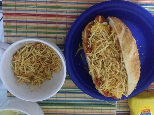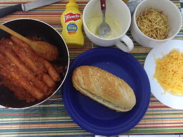 Salsa de salchicha, queso crema, mozzarella, patata, mostaza