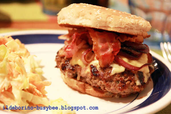 Añadir la carne a un tazón grande y mezcle brevemente con la mitad de la cebolla picada, salsa de tomate, mostaza, pan rallado, una pizca generosa de sal, y algunos de pimienta negra molida. Poner la carne en la nevera durante 1 hora. Cortar la cebolla restante en aros finos. Calentar una sartén de fondo pesado y seco freír el tocino hasta que dorado por ambos lados luego de ponerlo en algunas toallas de papel. Forma las dos hamburguesas con la mezcla de la carne durante la cocción los aros de cebolla en la grasa de tocino. Una vez cocido poner la cebolla en un bol y cocinar las hamburguesas en la misma sartén. Darles vuelta, coloque un puñado de queso sobre cada hamburguesa y cubrir la sartén con una tapa para que el queso se derrita. Cortar los panes por la mitad y tostarlos. Cuando la carne está casi cocida pone el bacon y la cebolla en la sartén. Servir la hamburguesa dentro del bollo de pan con unos aros de cebolla y rebanadas de tocino 3. Servir con una ensalada o como con una simple ensalada de col como lo hicimos.