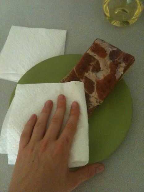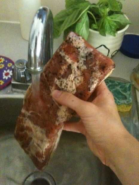 Imágenes: enjuague el tocino de curación exceso, acariciando el tocino seco