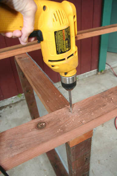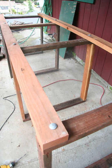 4. Fije los restantes 9 pies 2 x 4 a la parte posterior de la parte superior repitiendo el proceso utilizado para fijar las placas base.  Usando una escuadra de carpintero, asegúrese de que el recipiente es cuadrado, luego apriete todos los tornillos.