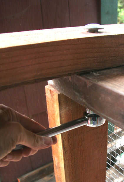 3. A través de cada unión de tablero y divisor, perfore un orificio de 1/2 pulgada centrada en 1 pulgada del borde.  Asegurar las tablas con los pernos de carruaje, pero no apriete todavía.  Gire el lado derecho de la unidad para que las tablas largas son en la parte inferior.