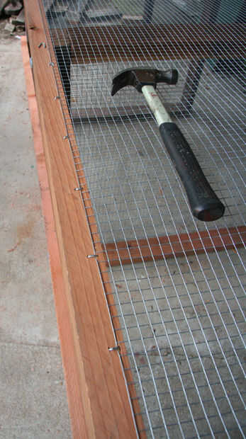 5. Fijar la longitud de 9 pies de tela metálica en la parte posterior de la cubeta con grapas cada 4 pulgadas alrededor de los marcos externos e internos.
