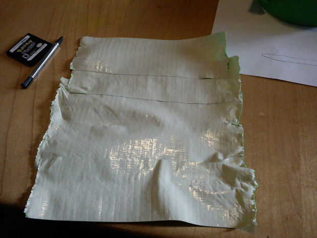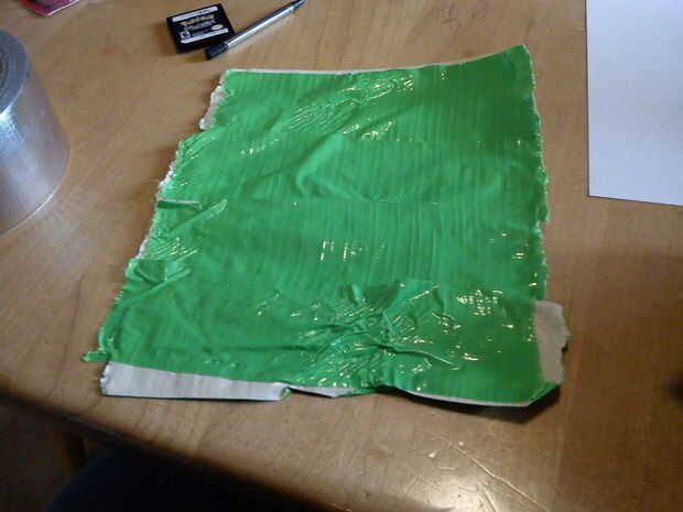De cinta A utilizar para cubrir avout 2.5 x longitud (superior a inferior) de la consola y hacer una especie de "tela." Cinco piezas fue suficiente para mí. No te preocupes los extremos no ser perfecto, que los cubriremos más tarde. Coloque cinta sobre la tela, lado adhesivo en la parte adhesiva, para hacer un paño de cinta del conducto, por así decirlo. Luego, doblar la longitud de cinta B sobre los lados a) los bordes irregulares y B) para que se vea cool. Libremente debe sostener la consola doblada encima, con mucha proyección.