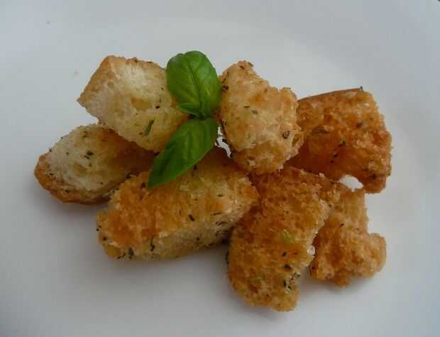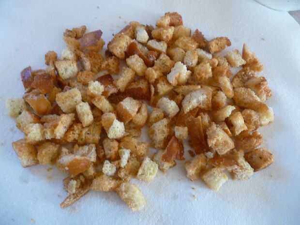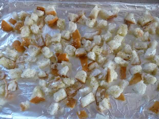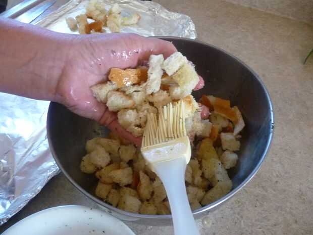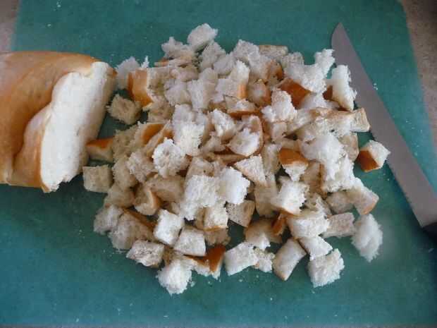 (Si el pan es fresco y suave, cortado en cubos y hornear a 200 grados durante 5-7 minutos. Apague el horno y dejarlos secar en el horno caliente durante una hora o 2. Si los centros tienen humedad, resultará en un recipiente no-gran, cauchutoso.)