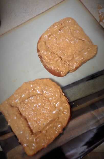 Pone sus dos rebanadas de pan al lado de otros. Tomar el cuchillo y se reúnen una cantidad conservadora de mantequilla de maní para poner dos rebanadas de pan. Sólo tendrás una extensión fina de mantequilla de maní en este punto.