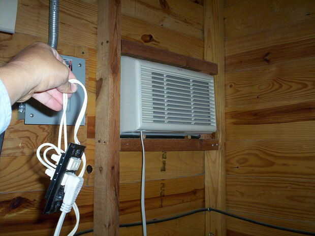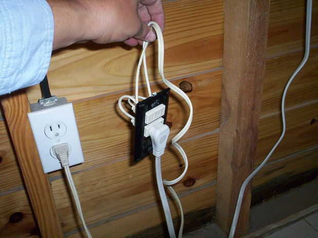 Clavija del acondicionador de aire del enchufe de pared y enchufe el cable de extensión en el enchufe de la pared del acondicionador de aire. Ahora enchufe enchufe del acondicionador de aire enchufe del cable extensión como se muestra en la imagen. Tenga en cuenta que uno de los enchufes en el cable de extensión fue cambiado de puesto hacia arriba para acomodar la patilla de toma de tierra enchufe del acondicionador de aire.