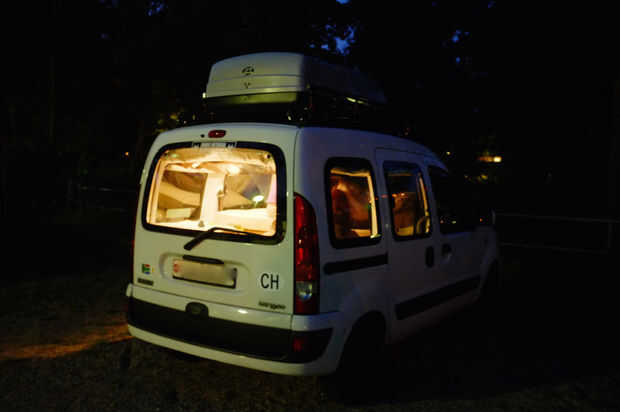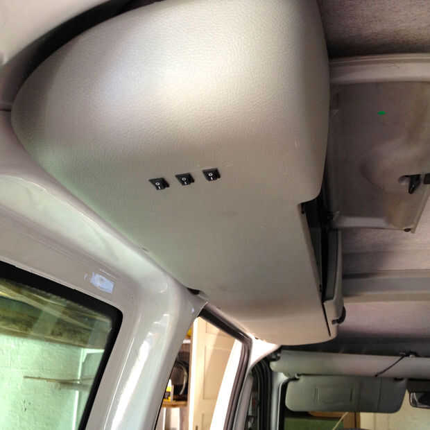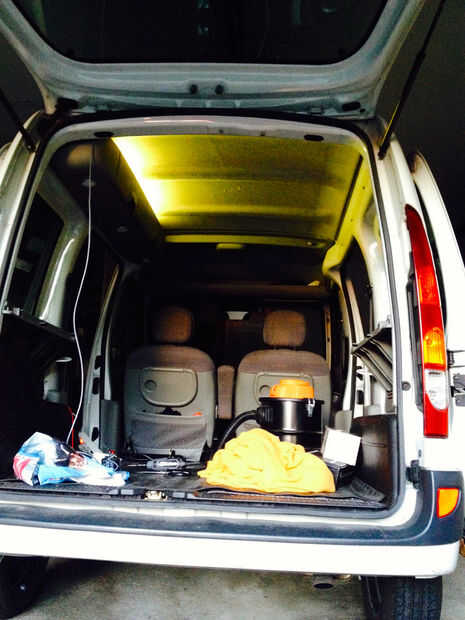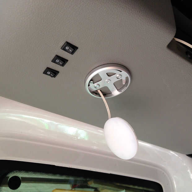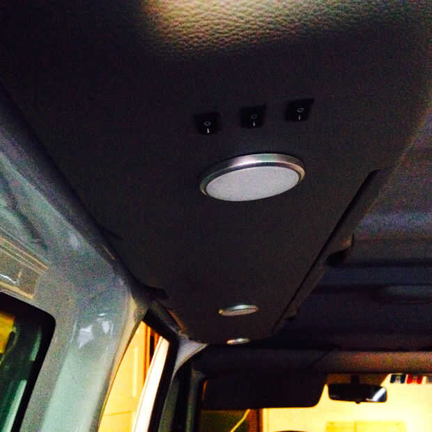 Tiene una buena fuente de luz cálida mejora enormemente la sensación en el coche. Puesto que ya tenía un perro guardián de batería instalado, simplemente até tres focos con LED de IKEA en la parte inferior de las cajas de techo de estilo avión. Son muy planos y pueden ser pegadas o atornilladas al plástico muy bien. Están destinados para la alimentación principal, pero si lees las especificaciones de la fuente de alimentación funcionan con 12V DC. Perfectamente para un aparato del coche.