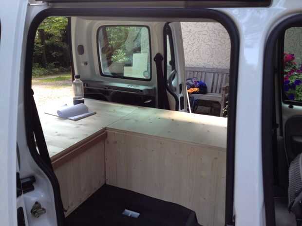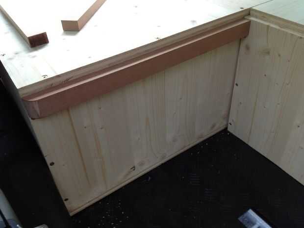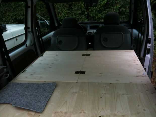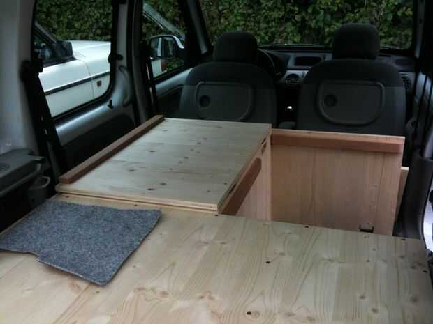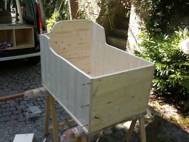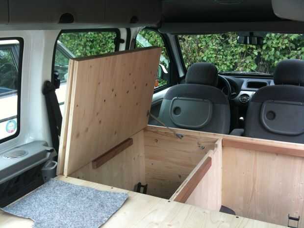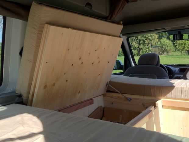 La parte superior de la caja está conectada a través de las bisagras y se puede abrir. Mientras que el open se mantiene en su lugar por un resorte de presión de gas. Tiene un volumen sorprendentemente grande y lo uso para guardar mi paño y zapatos para el viaje. Superior de la caja es una segunda hoja madera montada por las bisagras. Durante la conducción depende de la caja y mientras duerme se dobla hacia el otro lado. Así usted tendrá una plataforma completamente incluso para su colchón. La segunda placa se basa en dos barras de madera que se atornillan a la caja de la parte trasera y el tablero de extensión. El extremo libre de esta placa se refuerza en el lado libre con una barra de madera dura.
